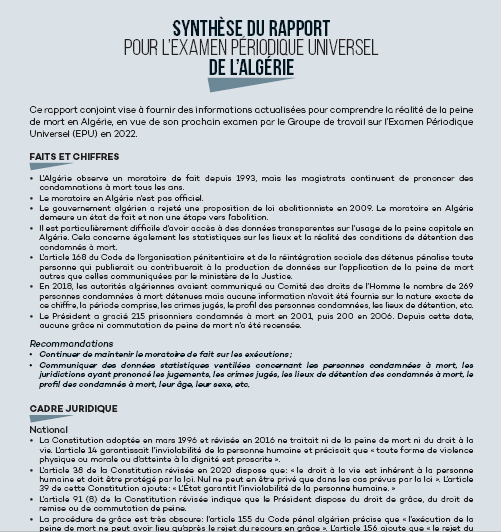 En 2018, les autorités algériennes avaient communiqué au Comité des droits de l’Homme le nombre de 269 personnes condamnées à mort mais aucune information n’avait été fournie sur la nature exacte de ce chiffre, la période comprise, les crimes jugés, le profil des personnes condamnées, les lieux de détention, etc. Il est donc particulièrement difficile de se rendre compte de la réalité de la situation de la peine capitale dans le pays.